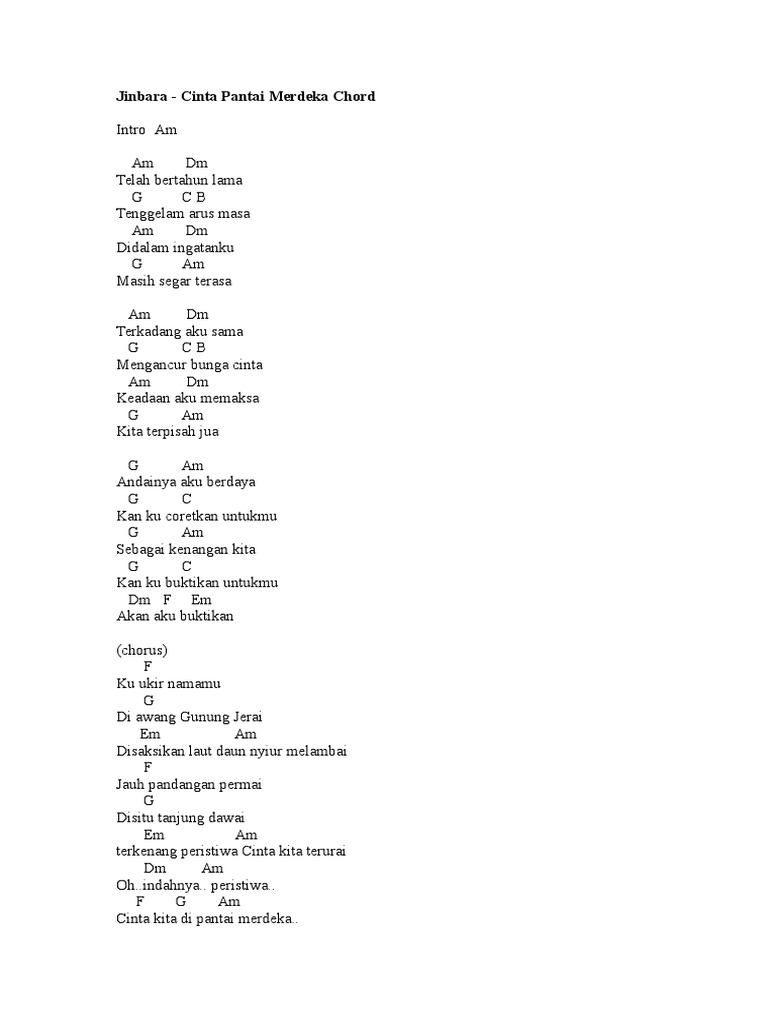 Laurence Munit Tropika-Cinta Pantai Merdeka Intro Am Am Am E Am Dm Telah bertahun lama G C Tenggelam arus masa Am Dm Didalam ingatanku G Am Masih segar terasa Am Dm Terkadang aku sama G C Mengancur bunga cinta Am Dm Keadaan aku memaksa G. Cinta Pantai Merdeka - jinbara Chord by EijaN. Last updated on 09122014.